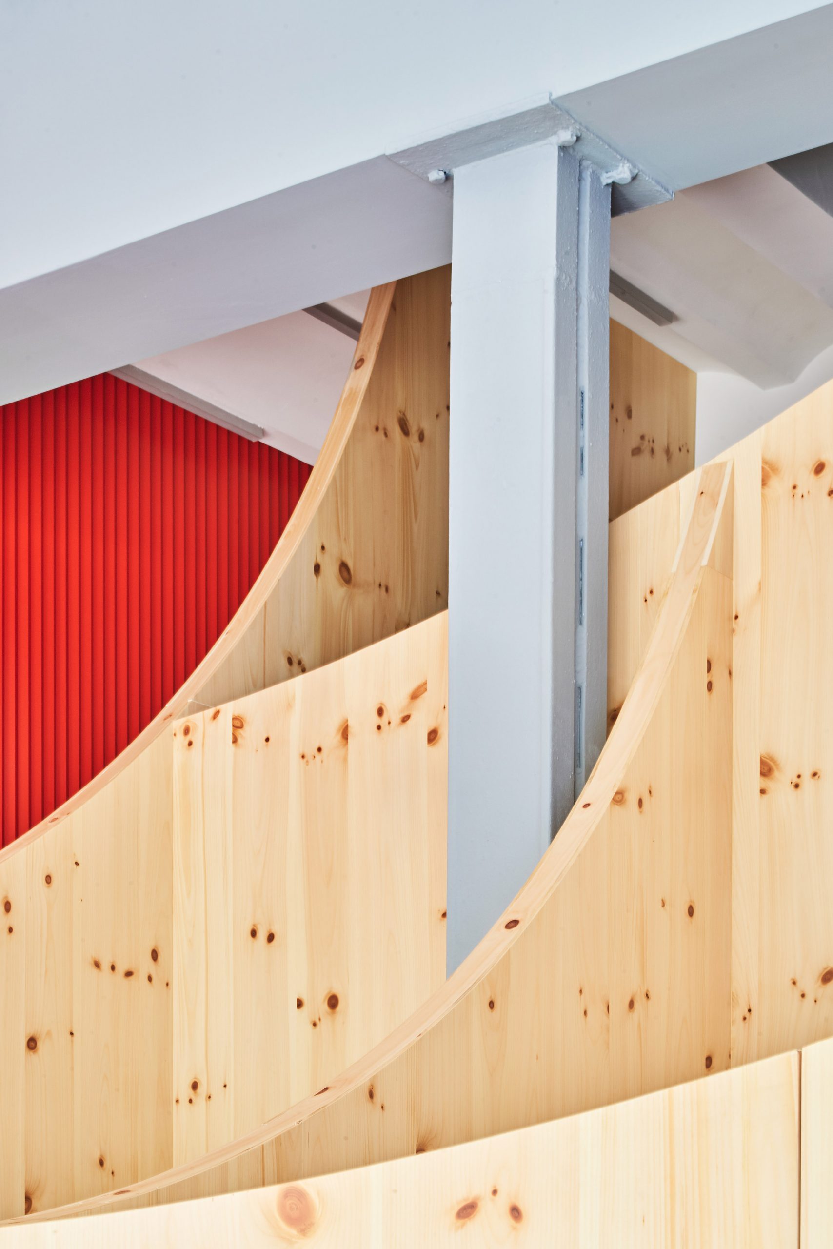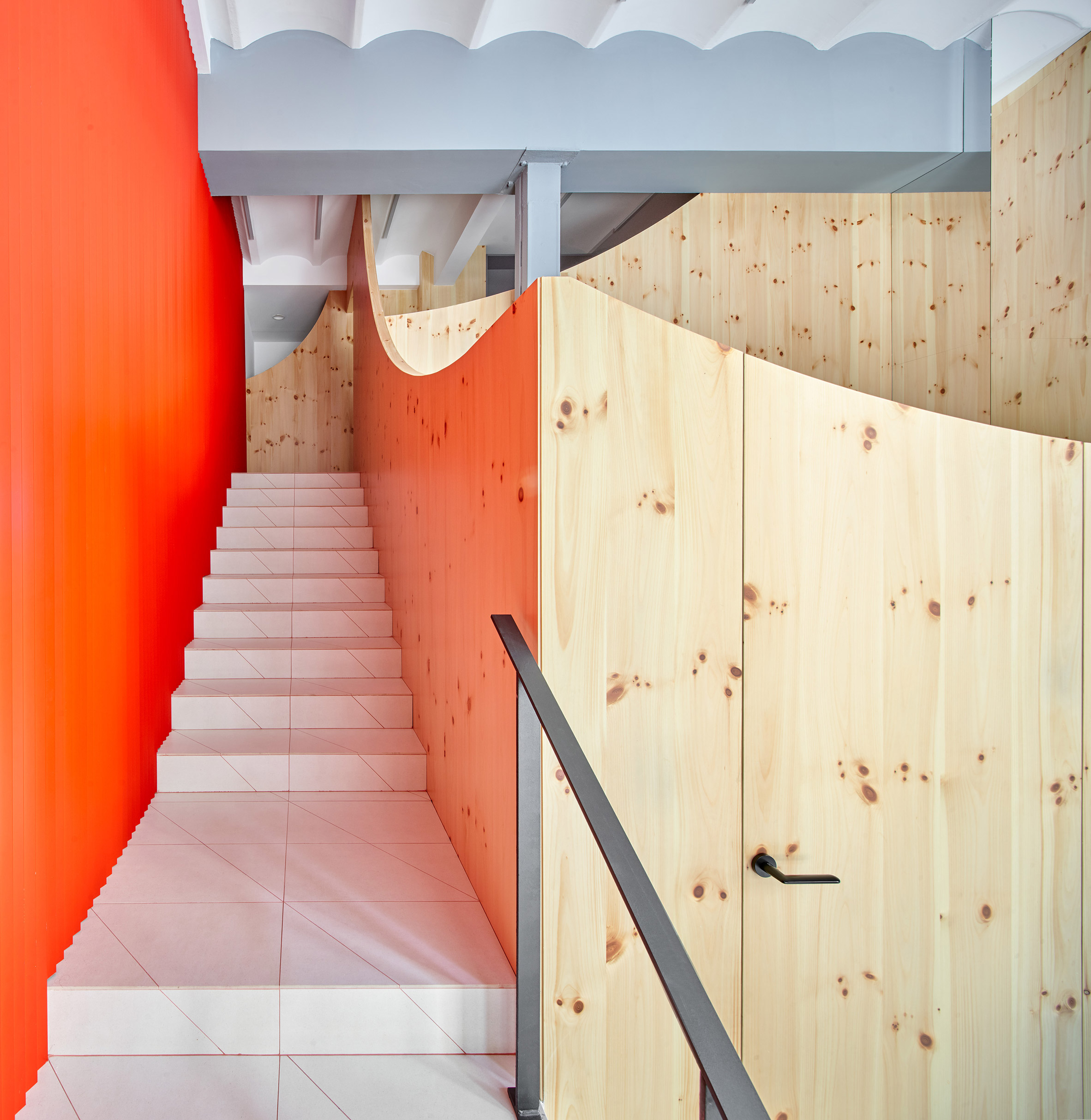 В допълнение към цвета на боровата дървесина архитектите са използвали цветовете от логото на Impress (червен, син и сив), за да подчертаят различни елементи от иначе неутралния интериор. Структурните елементи са боядисани в сиво, а стената, която върви по стълбите, е облицована с яркочервени листове от гофриран метал. Стената над входа е решена в синьо, а за керамичните плочки на пода е използвана червена фугираща смес.