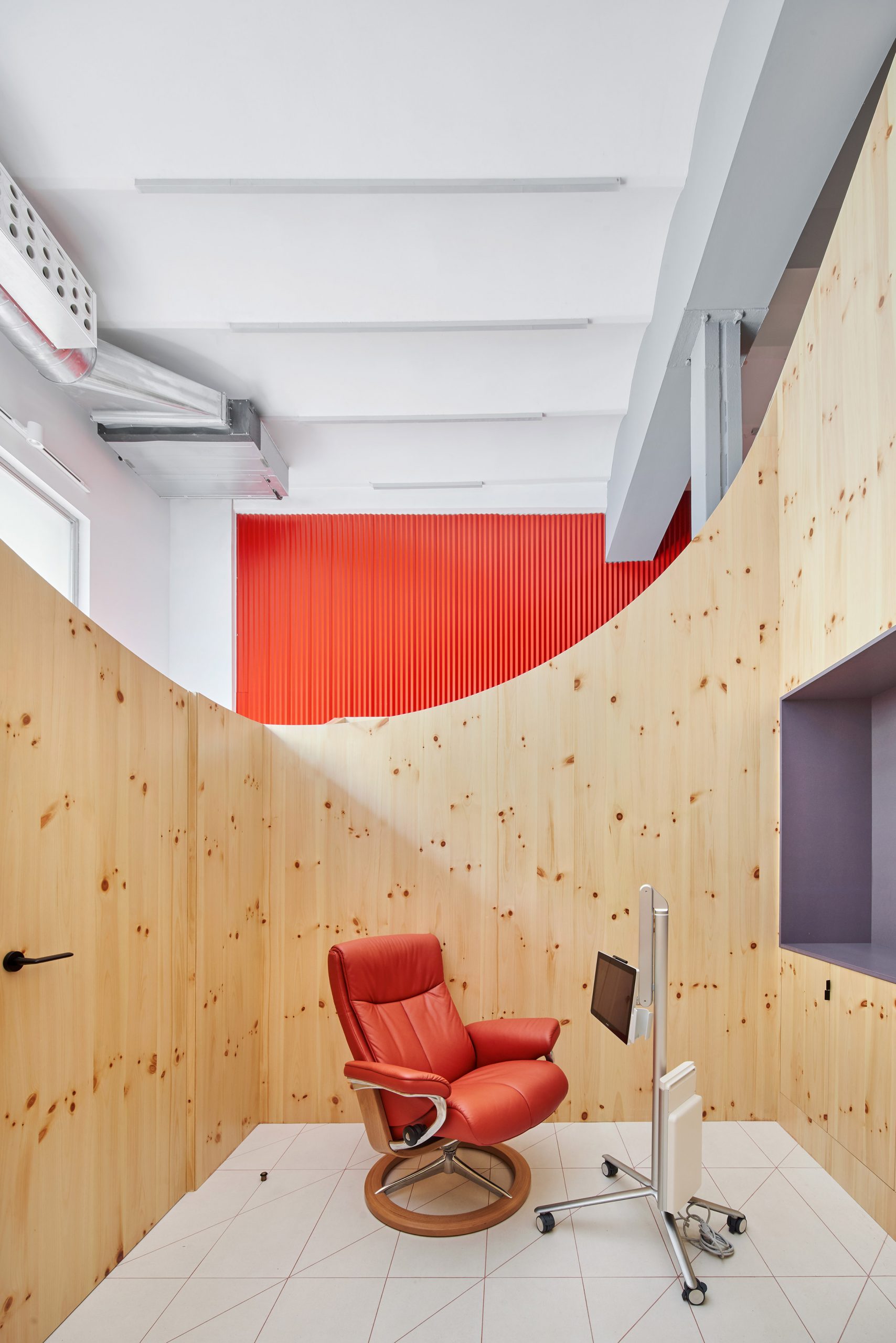 Дентална клиника в Барселона с интериорни прегради от борова дървесина във формата на усмивка
