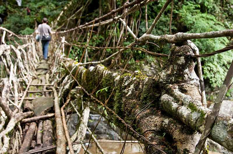 В североизточния индийски щат Мегалая жителите на отдалечени села са построили живи мостове по хълмовете Каси. Те са направени от корените на каучуковото дърво (Ficus elastica), които са оформени с помощта на бамбук и стволовете на Бетеловия орех. Тези необикновени примери за „жива архитектура“ изискват преди всичко търпение. Защото отнема до 15 години, докато мостът нарасне от 15 на 20 метра и е готов за употреба. За разлика от други конструкции обаче, живите мостове не се износват, а стават по-стабилни с времето, тъй като корените стават по-дебели. Твърди се, че най-старите мостове от този тип са на възраст до 500 години и имат товароносимост до 50 души. Отделни мостове се простират на разстояние до 30 метра.