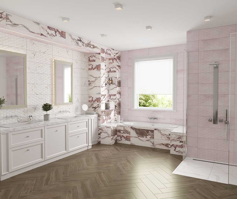 За любителите на класическата красота серията Marble предлага изискана гама от мраморни дизайни. Тя пресъздава вида на естествения мрамор, като същевременно предлага издръжливостта на керамичните плочки. Серията включва разнообразие от цветове, като бордо, зелено, бежово и класическият мрамор в бяло. Стенните плочки се предлагат в размер 24.4х74.4 R cм, а гранитогресите – 60х60 R см, които са подходящи за пода. Чрез тях можете лесно да адаптирате външния вид на вашата баня според вкуса и предпочитанията си.