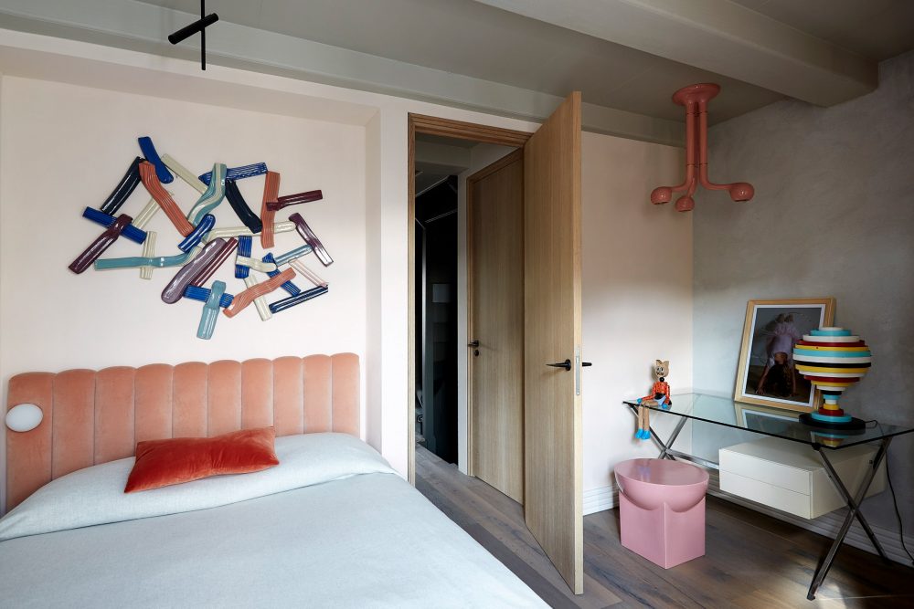 Смели цветове, материали и мебели се появяват в другите стаи на къщата. Повърхностите са боядисани в тъмно розово в една от детските стаи, в която е поставена винтидж фигура на анимационния герой на Дисни – Плуто.