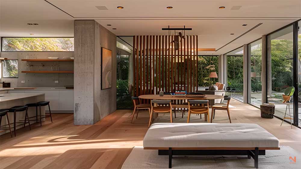 Дневната зона с отворен план допълнително подчертава връзката между вътрешното и външното пространство