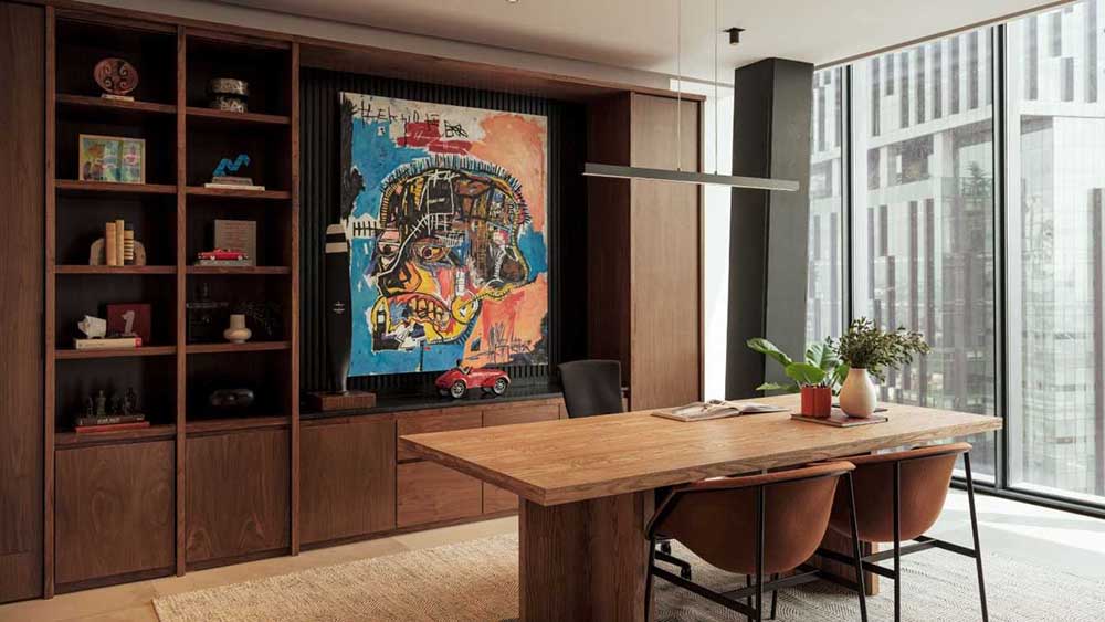 В по-големия офис палитрата от материали е умишлено семпла, с повърхности, които взаимодействат помежду си, без силна зависимост от цвят. Когато цветът присъства, той е въведен сдържано — като акцент, който придава характер, без да доминира или да претоварва пространството.