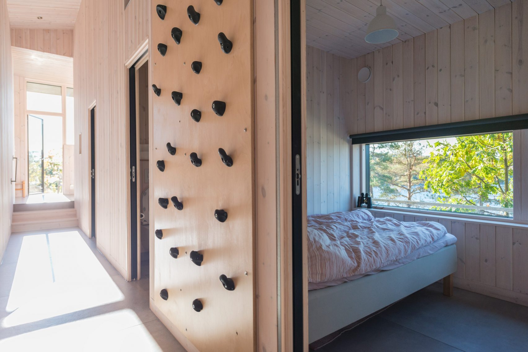Екстериорът на сградата е облечен в смърч, който отразява сивия оттенък на скалистия пейзаж. Вътре отново е използван смърч, който покрива стените и таваните и осигурява контрастна палитра.