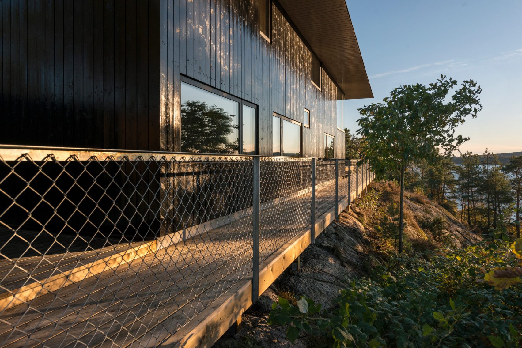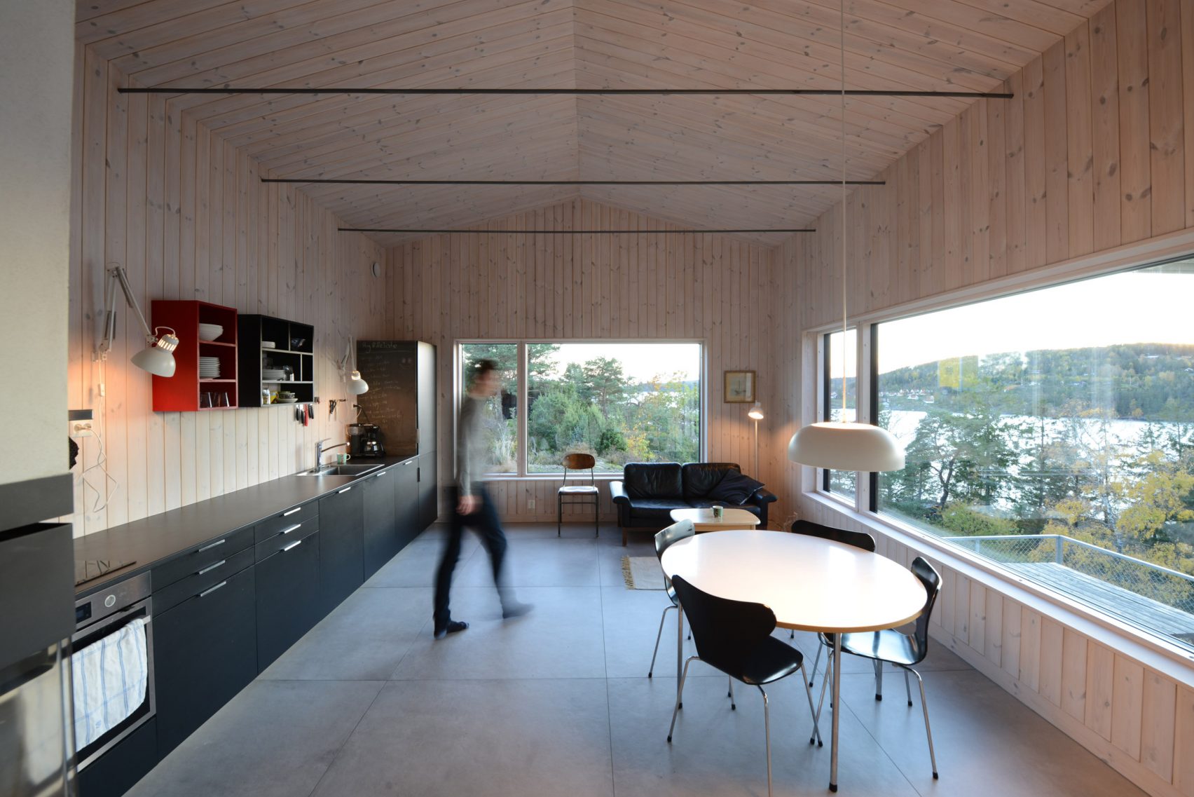Съществуващата стара хижа на парцела вдъхновява новата сграда и е преустроена като пристройка с голяма кухня и жилищна площ, свързана с новата конструкция.
